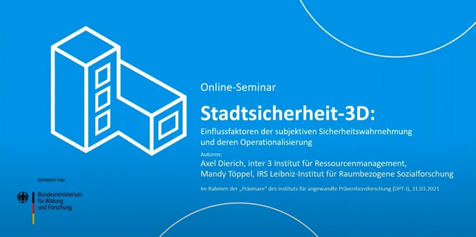 In welchem gesellschaftlich-urbanen Gesamtkontext steht eine Modellierung von Sichtbarkeit, Hörbarkeit und Einsehbarkeit? Welche Faktoren beeinflussen das subjektive Sicherheitsempfinden? Zum Auftakt einer vierteiligen Prävinarreihe zum Thema stellt Axel Dierich von inter 3 vor, wie die Einflussfaktoren auf das subjektive Sicherheitswahrnehmung identifiziert wurden. Der Vortrag geht zunächst auf die Ziele und das Forschungsdesign des Projekts Stadtsicherheit-3D ein und fokussiert dann auf die Forschungsergebnisse zu den aufgeworfenen Fragen.