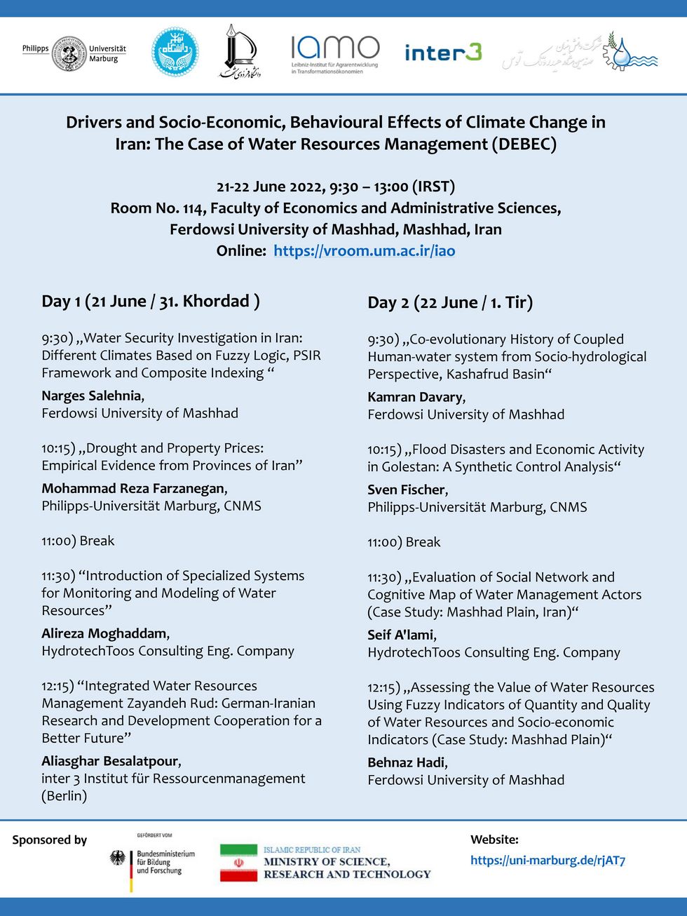 Das DEBEC-Projekt beleuchtet Ursachen und Wirkungen des Klimawandels im Iran v.a. im Hinblick auf Wasserressourcen. Beim Workshop geht es vor allem darum, mögliche Lösungsansätze für die durch den Klimawandel verursachten Probleme zu identifizieren, die im Bereich des Wasserressorucenmanagements gefunden werden können. Das Projekt wird vom Bundesministerium für Bildung und Forschung & MSRT finanziert.